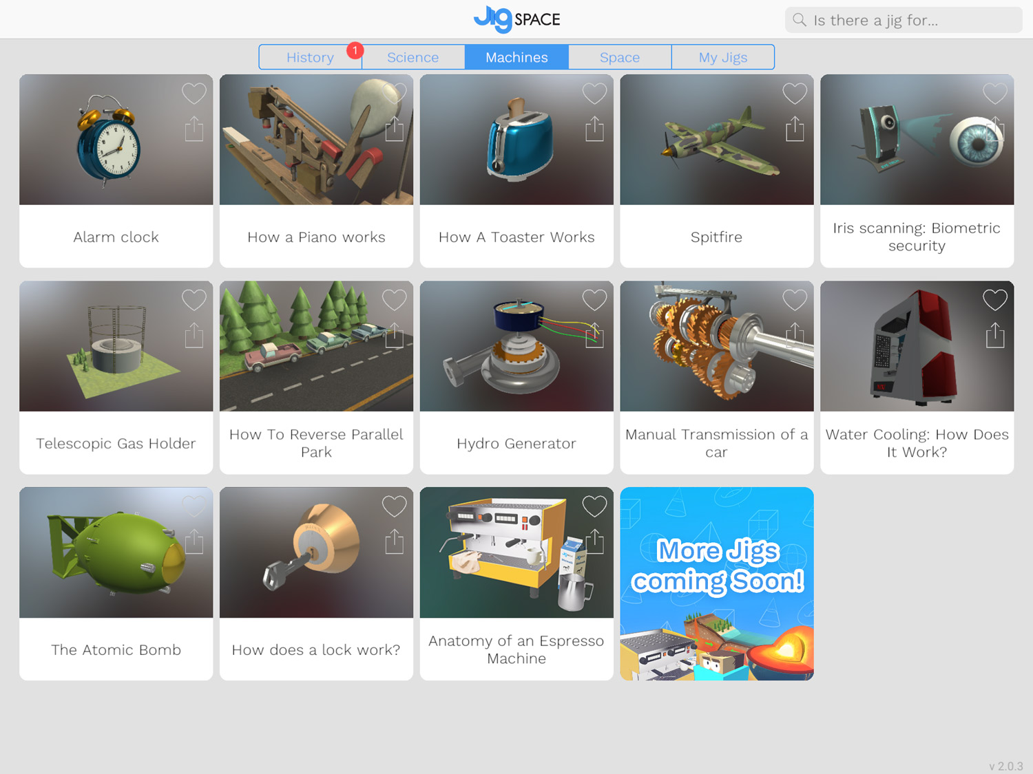When you launch JigSpace you reach the Library page where you can browse through all the available Jigs by category. You can also share a link to a Jig with other people and add ones that you like to your favorites.
